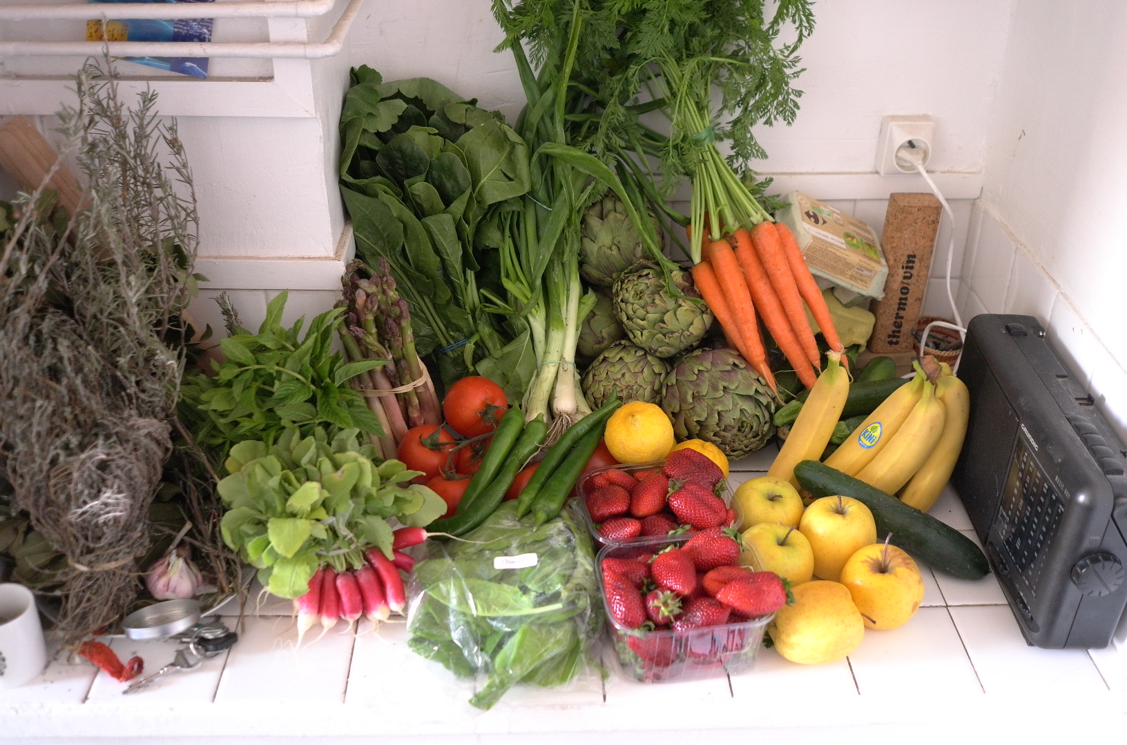 Soleil, un peu d’air frais à Noailles, temps idéal pour se balader entre les étals parmi les légumes de printemps, j’ai pris mes huit premières courgettes du pays, des petites, un concombre noa des Pays-Bas, celui-là je me demande comment il pousse, une belle botte de mauve 1,30 €, une d’épinards 1,20 €, cinq bananes de Côte-d’Ivoire 1,40 € le kilo, cinq pommes golden des Hautes-Alpes 1,20 € le kilo, plus haut Cours Julien j’ai trouvé quinze œufs tachetés de caille pour 2,90 € et une douzaine de poules 3,80 €, la marchande souriante se trompe en me rendant la monnaie, ah les beaux jours, une livre de fromage blanc de la ferme du Crépon à Sainte Mitre pour 3,50 €, en prime un euro la belle oseille, profitons encore en avril le temps court, une botte d’asperges plus fines trois euros, une de radis dodus un euro, retour à Noailles avec six tomates italiennes 1,20 € le kilo, cinq artichauts de même origine un euro le kilo, la botte de cébette un euro, trois citrons de Sicile non traités 1,20 € le kilo, cinq piments du Maroc 1,50 € le kilo mes premiers de la belle saison, ah les beaux jours, une botte de carottes 1,50 €, deux grosses barquettes de fraises de Sicile 2,50 €, et en guise de conclusion sinon de déclosion la menthe offerte une fois encore, le tout pour 32 €, le budget est dépassé mais quelles belles courses, bon marché et bonne cuisine à vous !