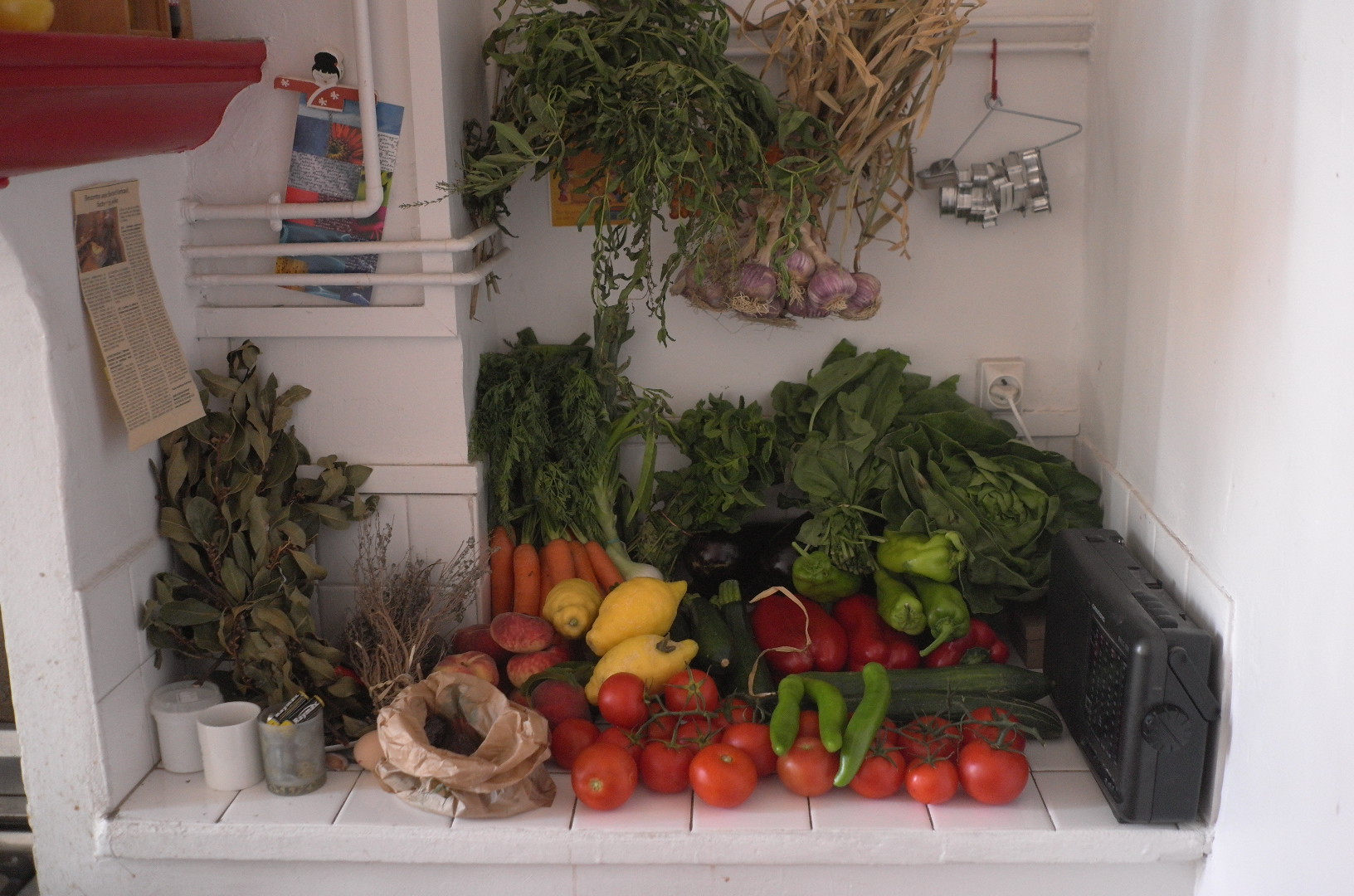 Retour à Marseille après les vacances, le bouquet d’ail violet continue à bien sécher, il me fera tout l’été, je ne suis pas le seul à partir, peu de monde ce matin au Cours Julien, la verveine qui accompagne mes nuits de canicule je l’ai prise à un euro, négociée car de gros bouquets étaient proposés à deux euros, un bouquet d’oseille à un euro pour une omelette acidulée, une belle laitue à 80 centimes, douze œufs 3,80 € j’en profitais pour ramener six ou sept boîtes vides, ensuite je descends à Noailles les haricots à prix d’or ce n’est pas pour moi, et je trouve six aubergines à 1,20 € le kilo du caviar oui encore, trois poivrons rouges à 1,80 € le kilo, quatre verts à 1,40 € le kilo, dix-neuf petites tomates à un euro le kilo, pas de souci en ce moment tout est mûr et du pays, deux concombres pour un euro, sept pêches plates à 1,30 € le kilo, sept courgettes petites à la chair blanche et ferme 1,20 € le kilo rêves de poêlées, trois pêches blanches de Saint-Rémy à un euro le kilo, la botte de carottes 1,50 €, la botte d’oignons 1,20 € et pour couronner le tout une dizaine de dattes medjoul de la pure confiserie à neuf euros le kilo, trois citrons non traités de Sicile à 1,80 € le kilo, un bouquet de menthe à soixante centimes et trois piments offerts, enfin au retour car il fait chaud chez la fromagère de la Crau une faisselle de chèvre pour 2,10 € et une tomette de chèvre au même prix, de belles courses pour trente euros en tout, qui dit mieux ? bon marché et bonne cuisine !