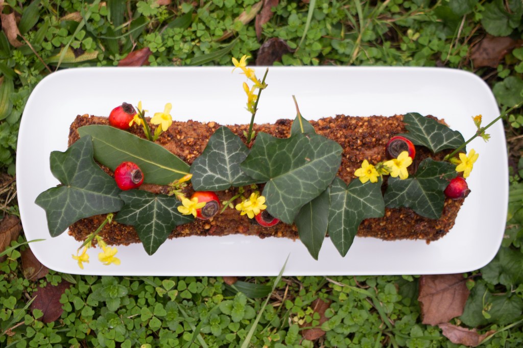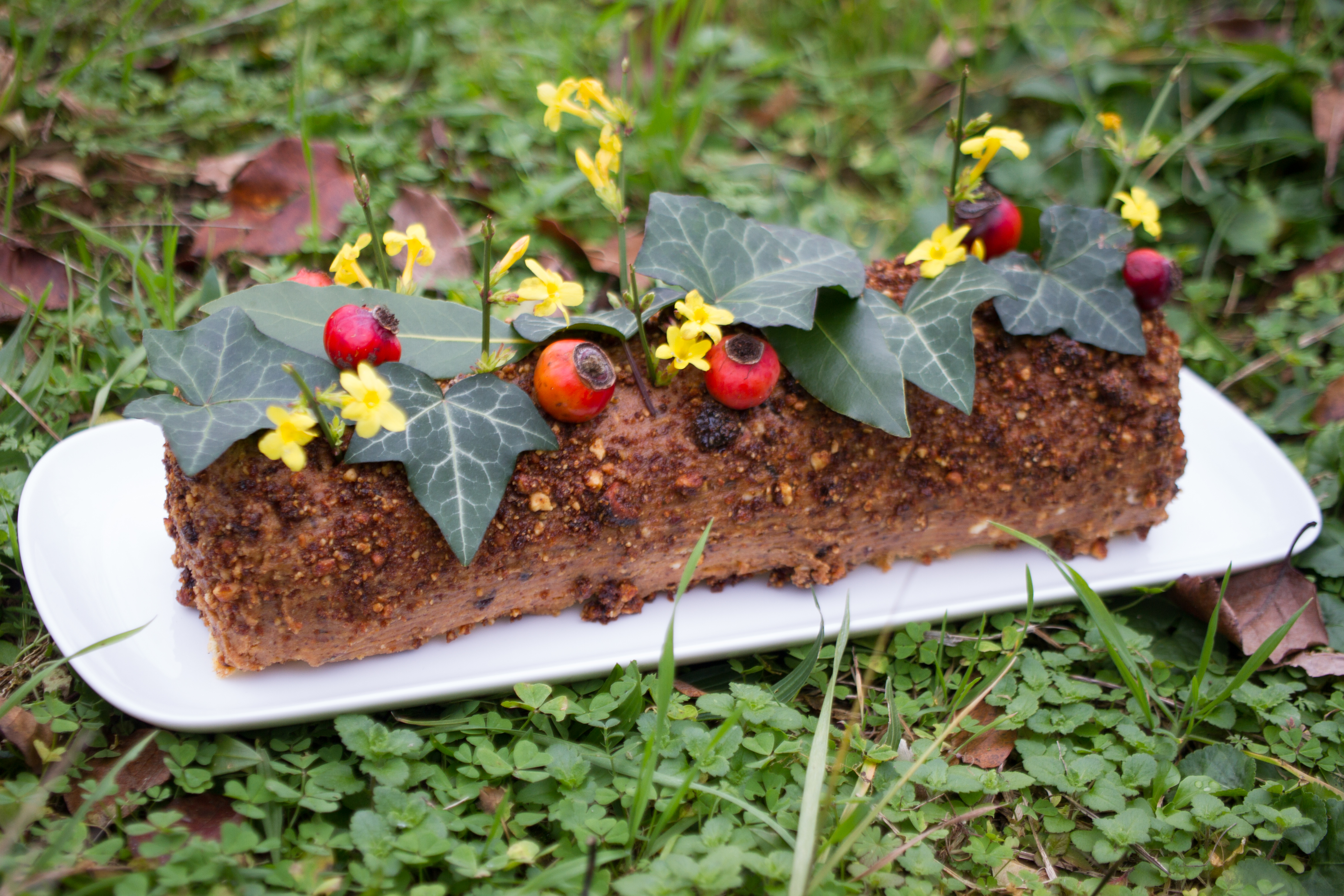 Bûche au pralin décoration du jardin, réalisé pour le 25 décembre 2023, à quatre mains.